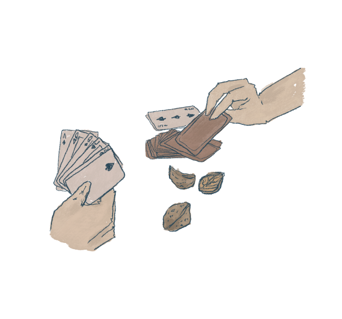 E le carte. Il momento più bello è quando qualcuno si addormenta, i più piccoli sono sul divano, gli uomini con le braghe aperte e gli occhi chiusi, allora la nonna tira fuori le carte e le noci.