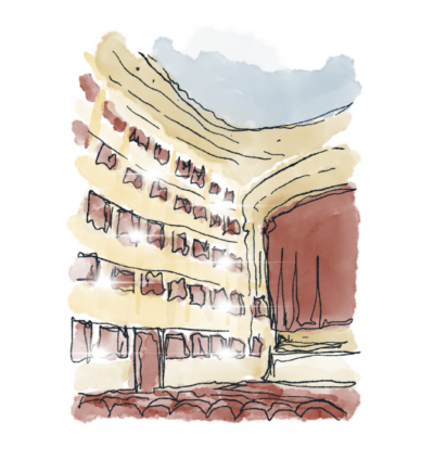 Allora ci sono poltrone di velluto rosso, e logge rosse incorniciate dall’oro dei palchi, con un soffitto affrescato d’azzurro, come Toledo, come il mare, come gli occhi del cameriere del bar di stamattina. Poi c’è lo spazio per l’orchestra, un lungo e pesante sipario di velluto, di quelli che si aprono e smuovono l’aria, che anche la persona seduta nel punto più alto, scomodo ed economico riesce a percepirne la pesantezza.