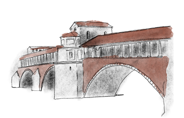 Borgo Ticino è collegato al centro storico di Pavia dal Ponte Coperto (o Ponte Vecchio), distrutto durante la seconda guerra mondiale, ad oggi cammino, anzi, corro lungo un ponte ricostruito fedelmente nel ’51: con arcate, tetto e finestre laterali. È quasi deserto, c’è chi porta a passeggio il cane o chi corre al primo mattino, così mi unisco a loro ma solo per svegliarmi, per riprendere quel movimento, quel fiato sospeso che mi permette -quasi mi costringe- ad alzare gli occhi.