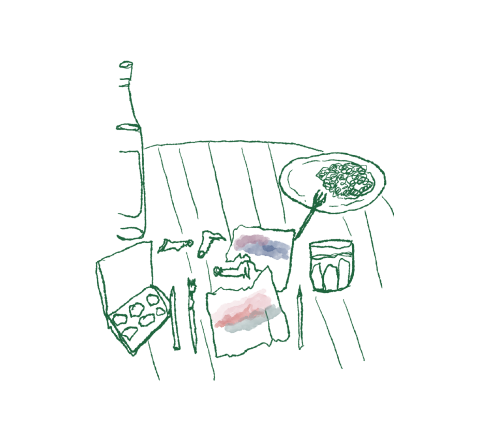 Lascio quella forchetta lì: chiudo i pennelli, gli acquarelli, i colori, le matite, infilo sei fazzoletti ancora umidi nel mio zaino e porto il piatto davanti agli occhi. L’acqua nel bicchiere è blu: c’ho pulito un pennello e neanche me ne sono accorta, non sono neanche sicura di non averci bevuto.